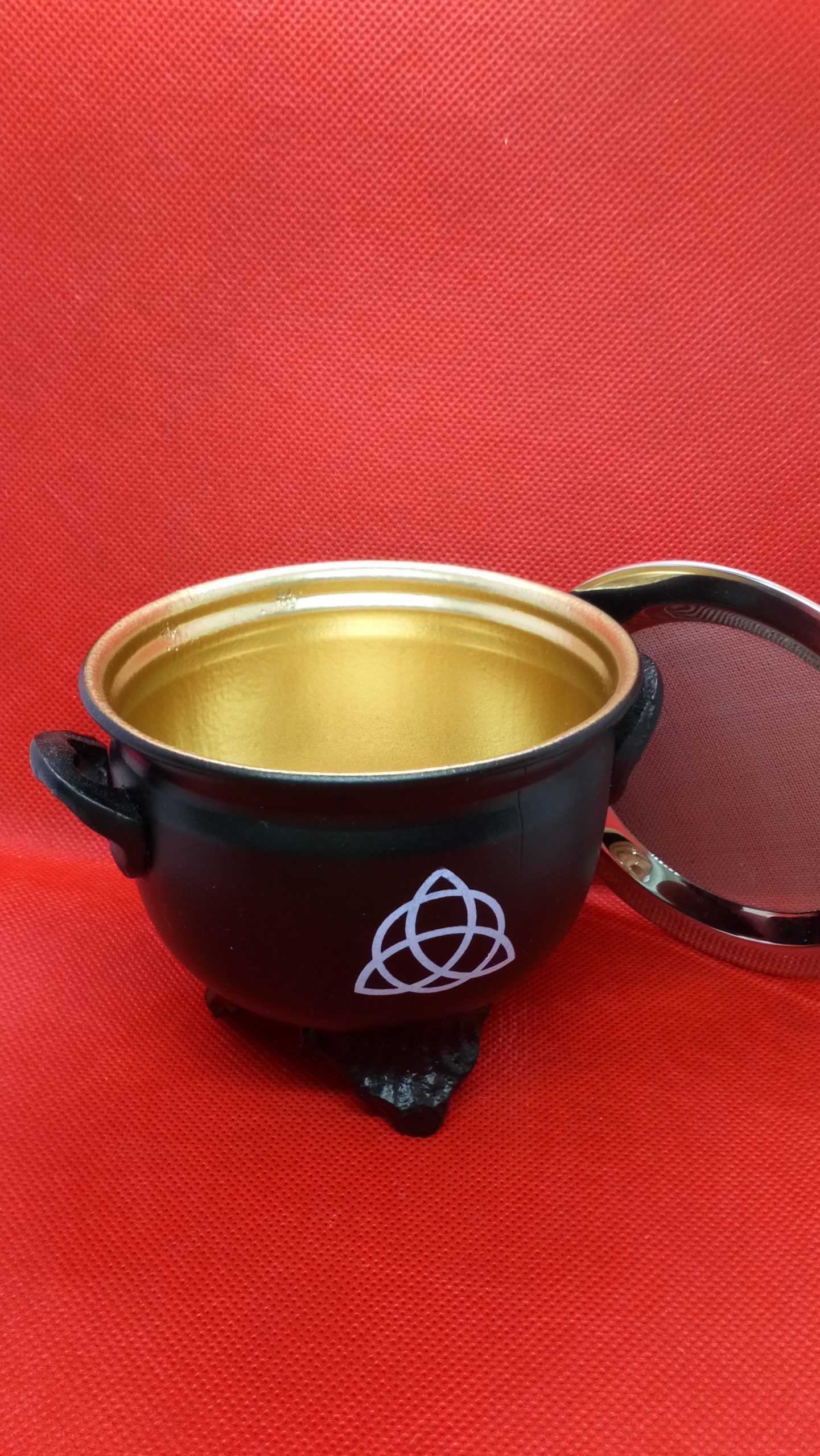 Black cauldron with pentagram design, complete with spark guard. Suitable for burning a charcoal block or cone incense.