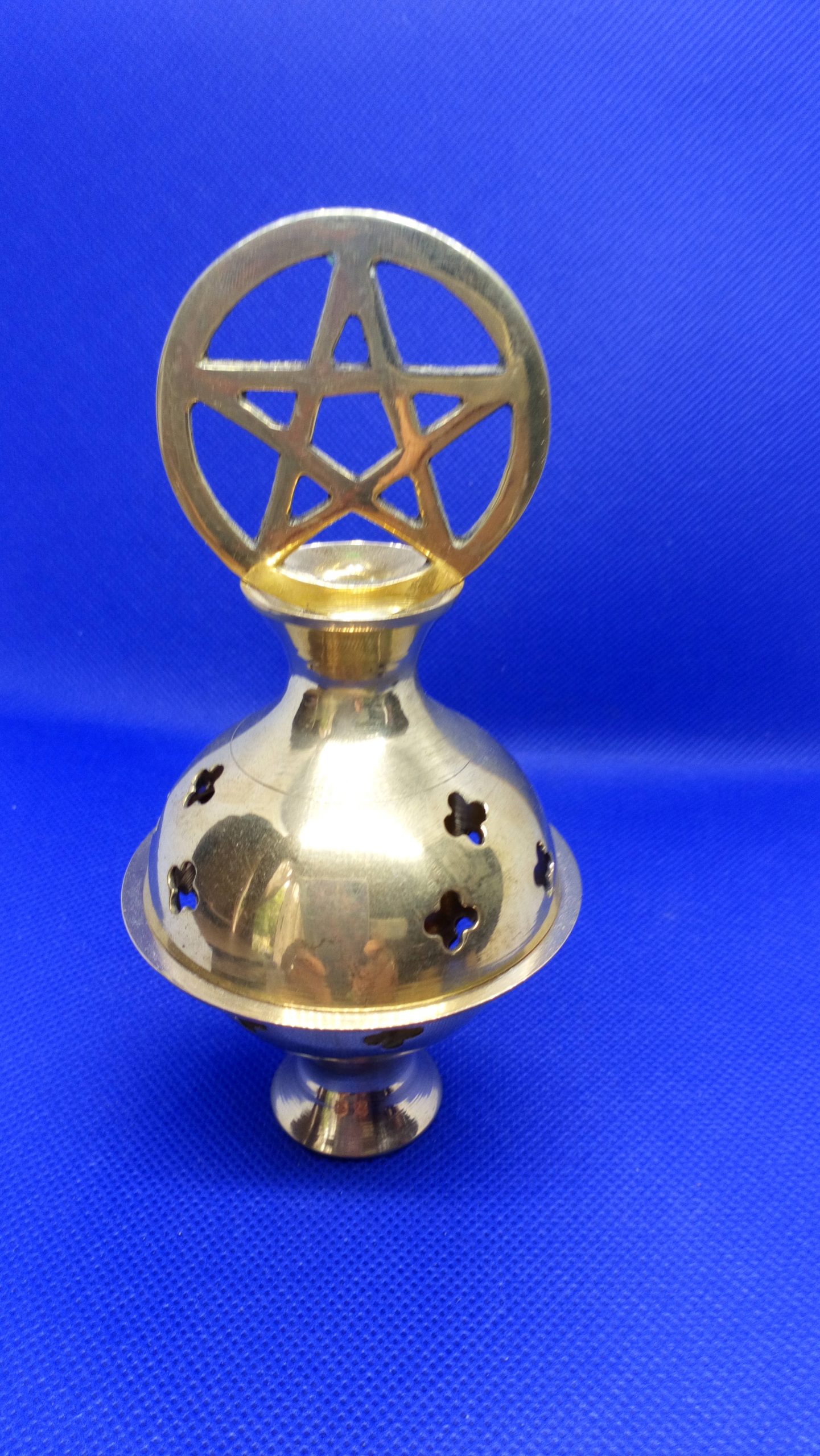 Gold coloured, metal incense burner with pentacle design. Suitable for burning a charcoal block or cone incense