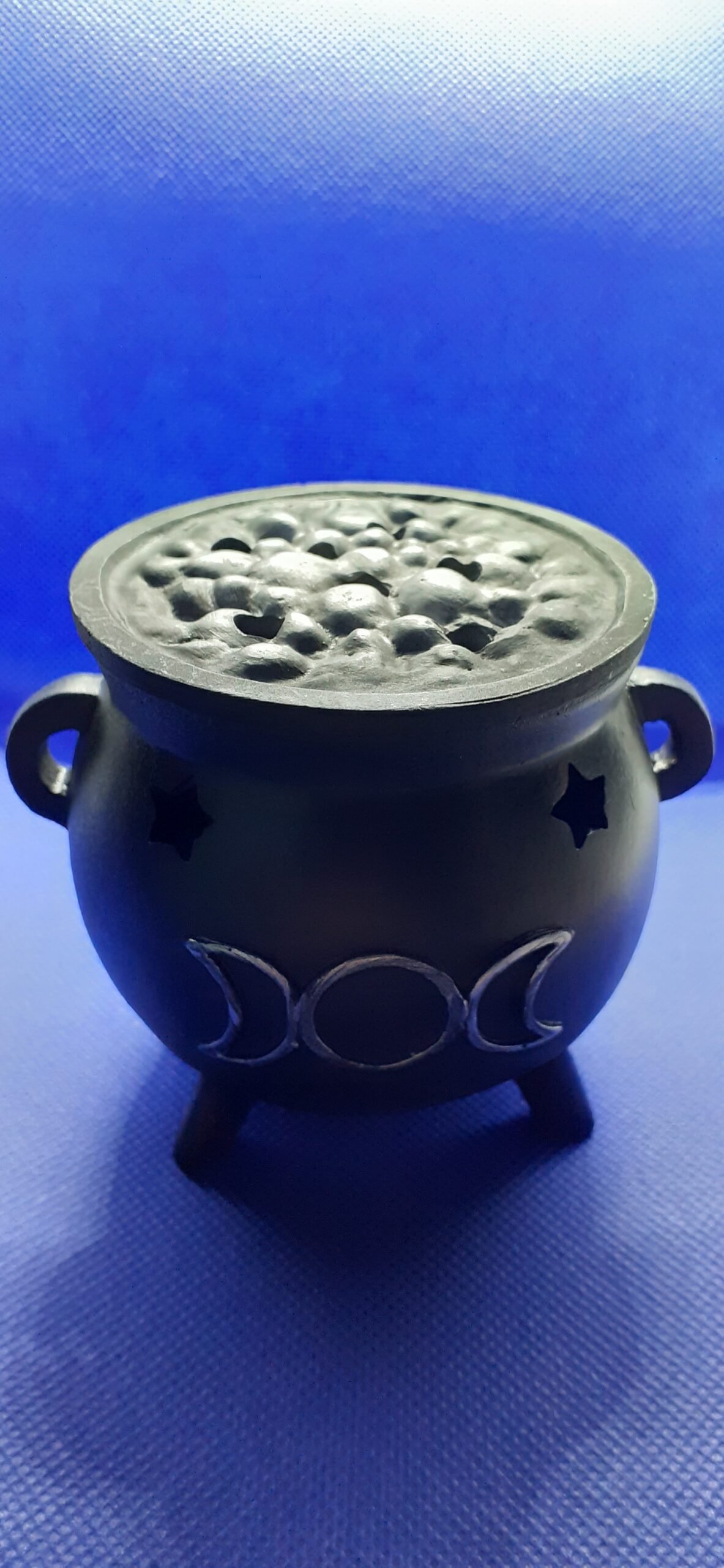 Black resin cauldron with triple moon design design, complete with bubbling cauldron spark guard – very effective when the incense smoke begins to rise. Suitable for burning cone incense only.