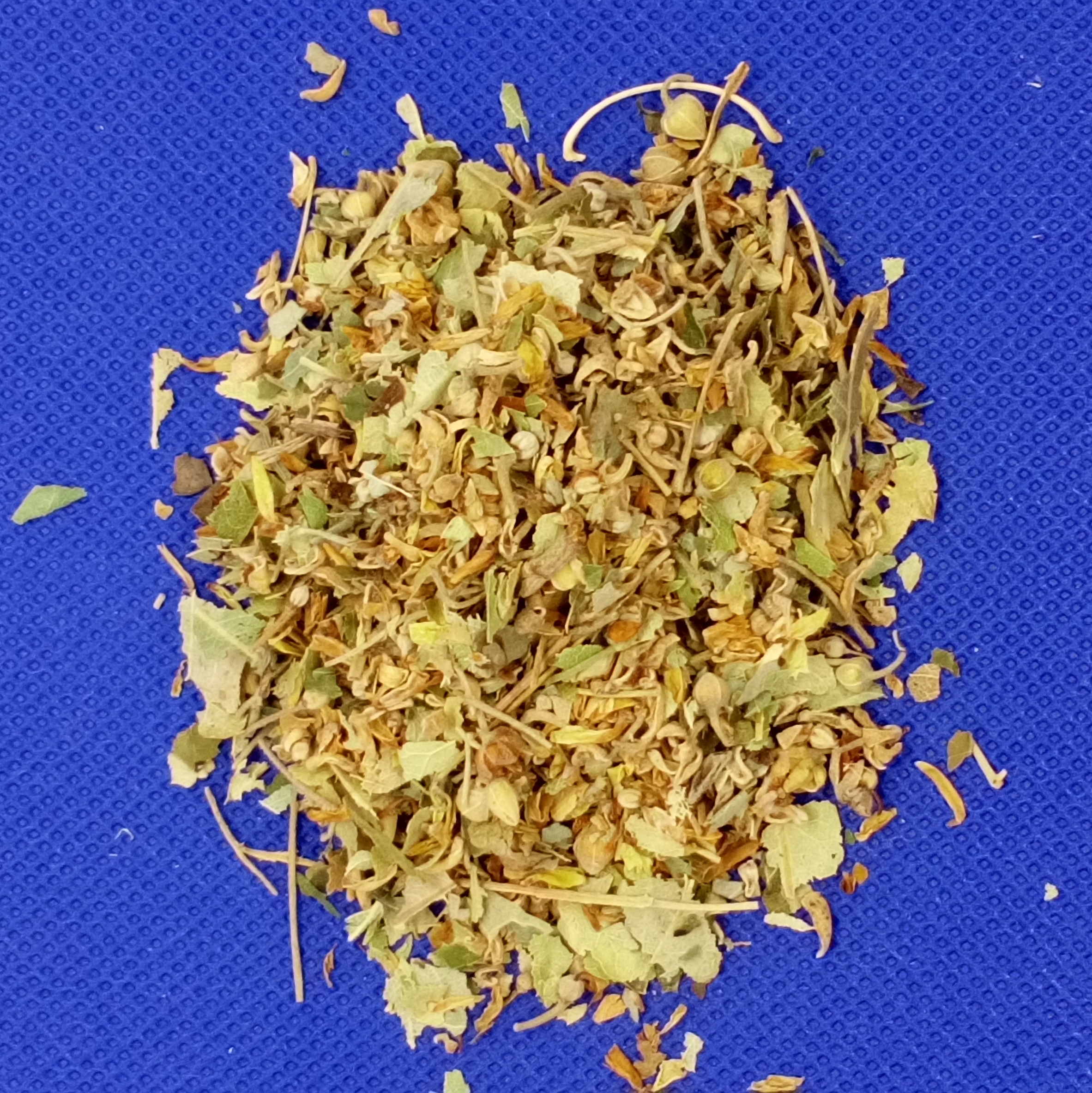Pleasant and fragrant. Lime flower is a circulatory, muscular and nervous system tonic. It is known for its relaxing and sedative properties and can help to ease anxious states, muscular spasms and restless leg syndrome. It is also indicated in cases of high blood pressure,  palpitations, menstrual cramps, fevers and cold and flu symptoms.