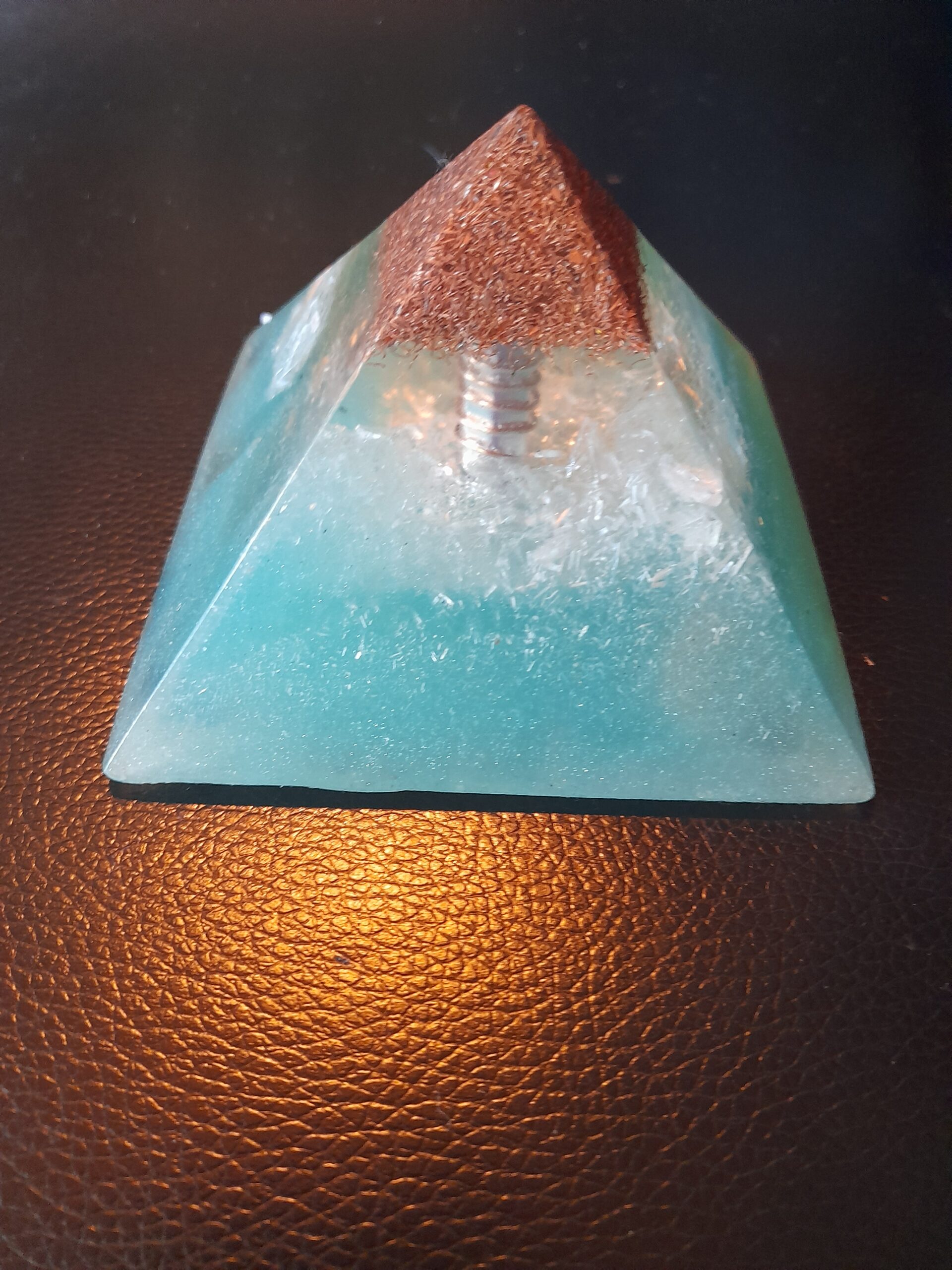 A handcrafted green coloured orgone pyramid, embedded with a clear quartz crystal, copper and selenite. The beneficial effects of having an orgone pyramid in your home include: Quality sleep, dispersal of electromagnetic stress and enhancement of spiritual, mental, emotional and physical health.
